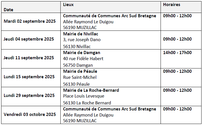 Des permanences auront lieu dans les communes de Nivillac, Damgan, Péaule et la Roche-Bernard.