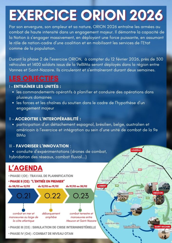 Durant la phase II de l’exercice Orion, à compter du 12 février 2026, près de 300 véhicules et 1400 soldats issus de la 9èBIMa seront déployés dans la région entre Vannes et Saint-Nazaire. Ils circuleront durant deux semaines.