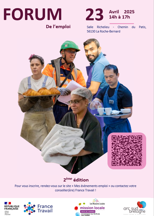 Les partenaires de l’emploi, France Travail, Arc Sud Bretagne et les Missions locales de Vannes et Redon, organisent le 2ème Forum de l’emploi à La Roche Bernard le mercredi 23 avril 2025 de 14h à 17h à l’espace Richelieu. Informations : Arc Sud Bretagne.
