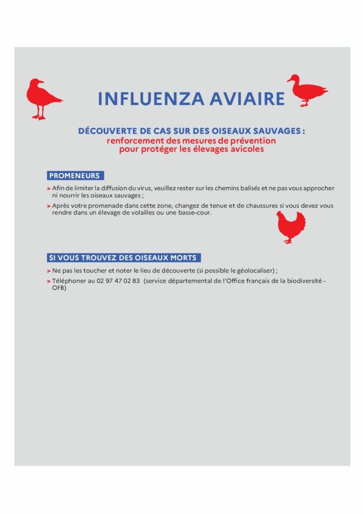 Le virus de l’influenza aviaire hautement pathogène a été détecté sur différentes espèces d’oiseaux de mer trouvés morts sur des zones côtières ou à faible distance du littoral breton. Il est donc nécessaire d’adopter la bonne attitude lors de découverte de cadavres d’oiseaux sauvages :