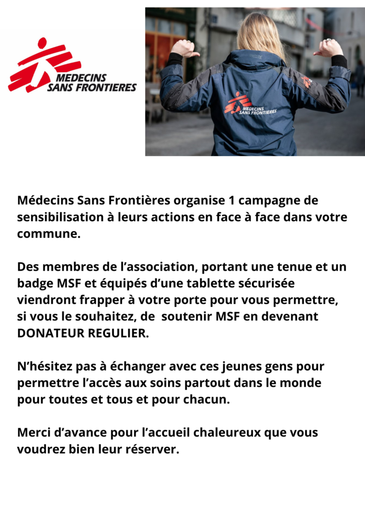 Vous rencontrerez donc peut-être des salariés identifiables au nom de MSF (veste et badge), qui vous informeront de leurs actions et objectifs, directement à votre domicile.