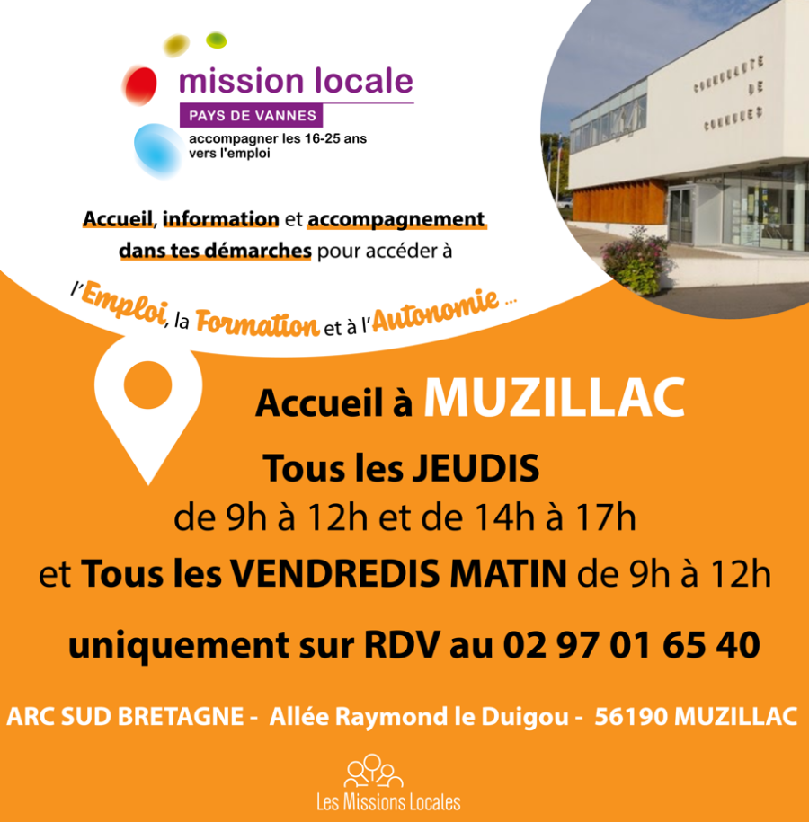La mission locale du Pays de Vannes, propose des permanences à Muzillac dans les locaux d’Arc Sud Bretagne :