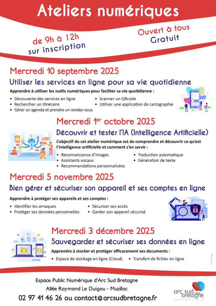 L’espace Public Numérique d’Arc Sud Bretagne organise toute l’année une série d’ateliers, gratuits et ouverts à tous, pour accompagner les usagers dans les pratiques de l’outil numérique. Plusieurs thématiques sont abordées, et les ateliers sont proposés régulièrement. Les ateliers se déroulent le matin, de 9h à 12h, sur inscription.
