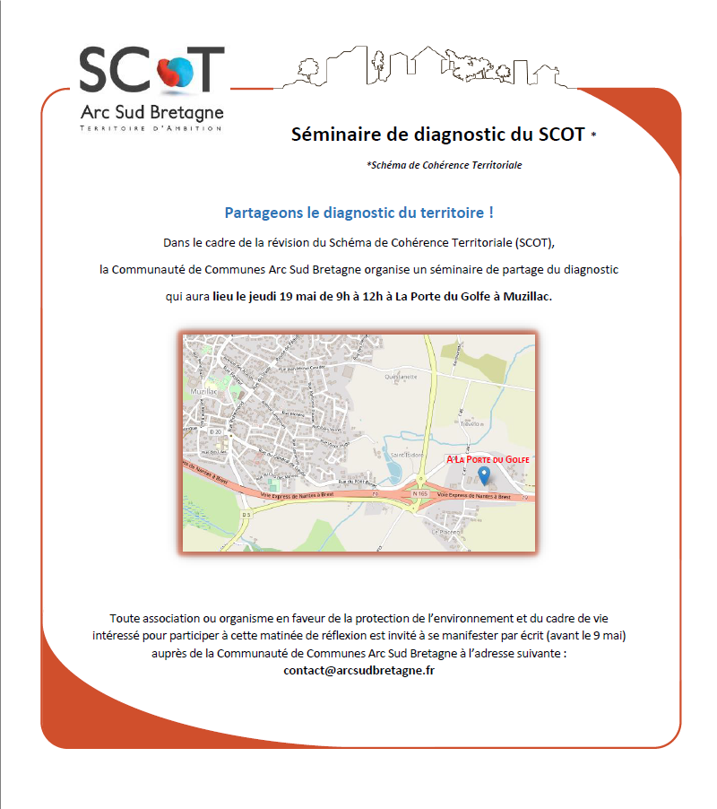 Dans le cadre de la révision du Schéma de Cohérence Territoriale (SCOT), la Communauté de communes Arc Sud Bretagne organise un séminaire de partage du diagnostic qui aura lieu le Jeudi 19 Mai de 9h à 12h à La Porte du Golfe à Muzillac.